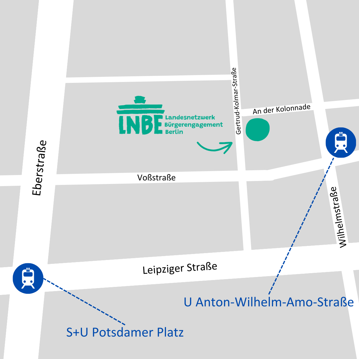 Unser Büro liegt zwischen S+U Potsdamer Platz und U Anton-Wilhelm-Amo-Straße. Von dort aus ist es jeweils ein Fußweg von ca. 5 Minuten bis zu unserem Büro.